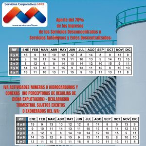 En materia de: Declaraciones Aporte del 70% de Los Ingresos de los Servicios Desconcentrados o Servicios Autonomos y Entes Descentralizados, y en lo referente al IVA para Actividades Mineras o Hidrocarburos y Conexas (No Perceptoras de Regalias de dicha Explotacion) para Declaracion Trimestral Sujetos Exentos o Exonerados, tenemos lo siguiente: