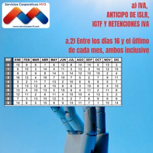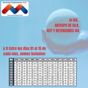 El presente artículo despliega una descripción especifica sobre fechas a cumplir por los contribuyentes ante el SENIAT conforme a su calificación, de surgir dudas en la aplicación quedamos a la disposición para atenderles.